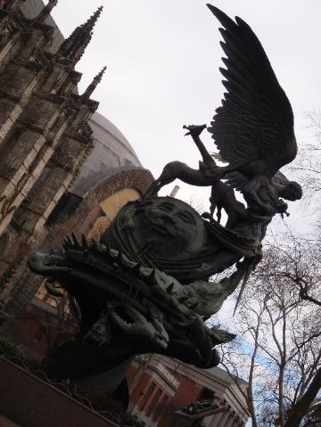 | The statue of Michael the Archangel defeating Satan in the courtyard next to the church. |